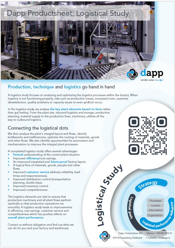 In addition to realizing the factory layout and warehouse mechanization and/or automation, communication and collaboration are very important in the factory world. Logistics can be found within every link within the factory, but also outside of it. Whatever your challenge, you need to find the balance between two divergent objectives: minimum cost for the factory and maximum service to your customers. Logistics cannot be seen separately from production and technology.